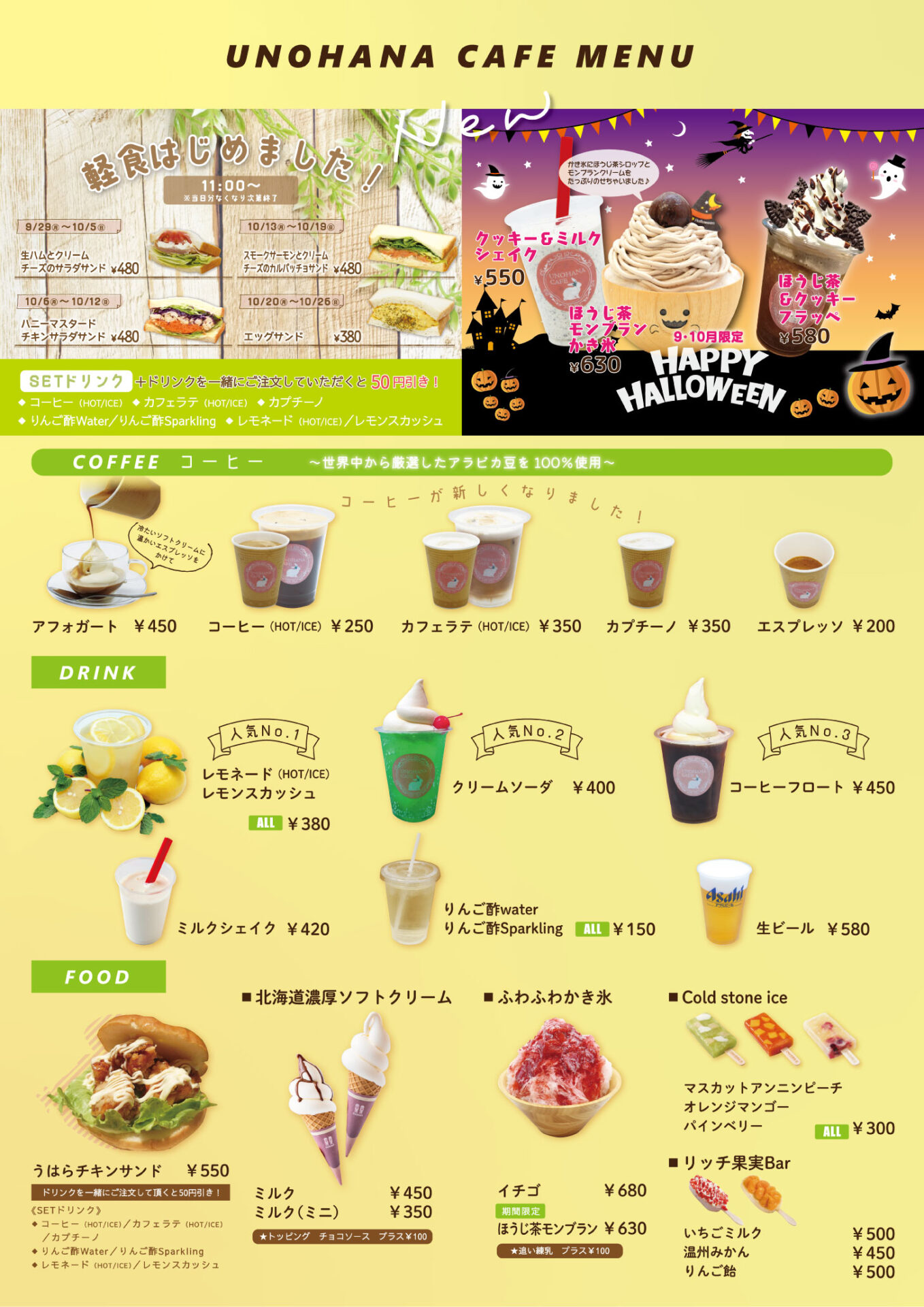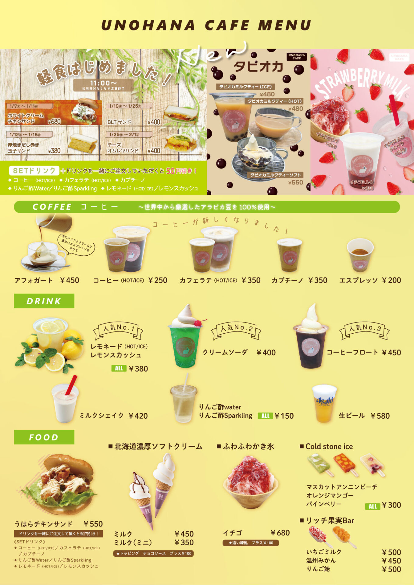 うの花カフェがリニューアル!! 数量限定!!手作り軽食も新登場!コーヒーも新しくなりました! もちろん北海道江別から直送した大人気ソフトクリームは人気NO1! さらにお風呂あがりにぴったりのレモネード・レモンスカッシュや口溶けふわふわのかき氷、絶品スイーツも是非、お召し上がりください!