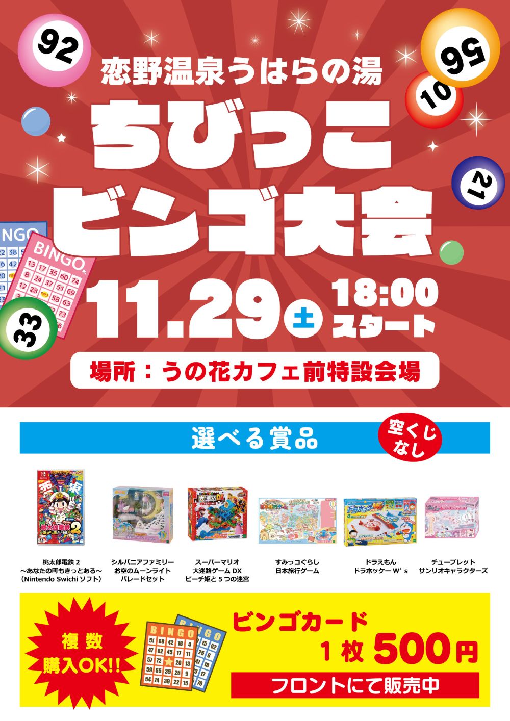 11月29日(土)18時00分よりちびっこビンゴ大会を開催いたします!ビンゴカードの販売は11月1日(土)~当日開催前まで100枚限定!!温泉フロントにて1枚500円で販売しております。